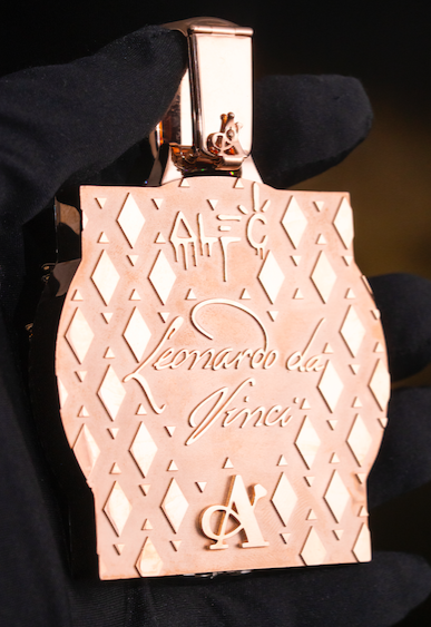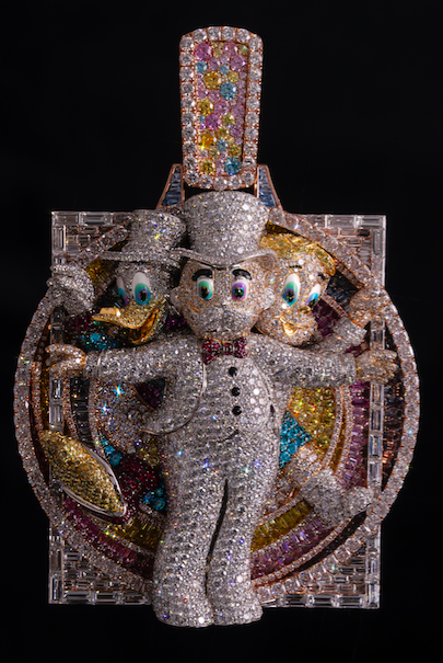Making use of large gem stones consisting of pink sapphires, blue aquamarines, yellow sapphires, A Jewellers have managed to capture the essence of Alec Monopoly in the pendant. The depiction of Alec’s Monopoly Man character alongside Scrooge McDuck and Richie Rich all play into the motifs of his art. The gem stones from the pendant are also mirrored in the chain itself, making for a complete, eye-catching design.