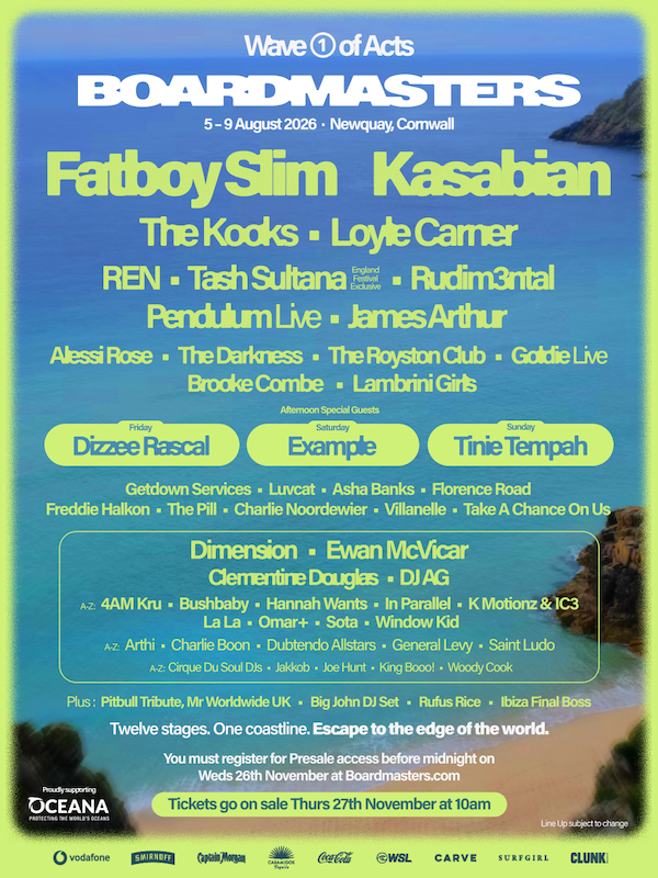 Taking place on 5th-9th August, Newquay’s Boardmasters have officially unveiled the first wave of artists for their 2026 instalment, with Fatboy Slim, Kasabian, Loyle Carner, The Kooks and more leading the names on the lineup.